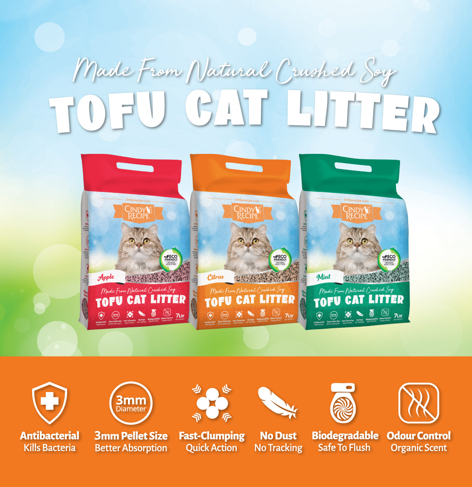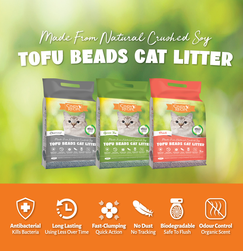 Cindy’s Recipe® Natural Tofu Beads Cat Litter is a 100 percent eco-friendly and sustainable cat litter. Made from soy beans and green pea fibre, it is safe and non-toxic; providing cat owners with peace of mind knowing that their cat litter is free of harmful ingredients.